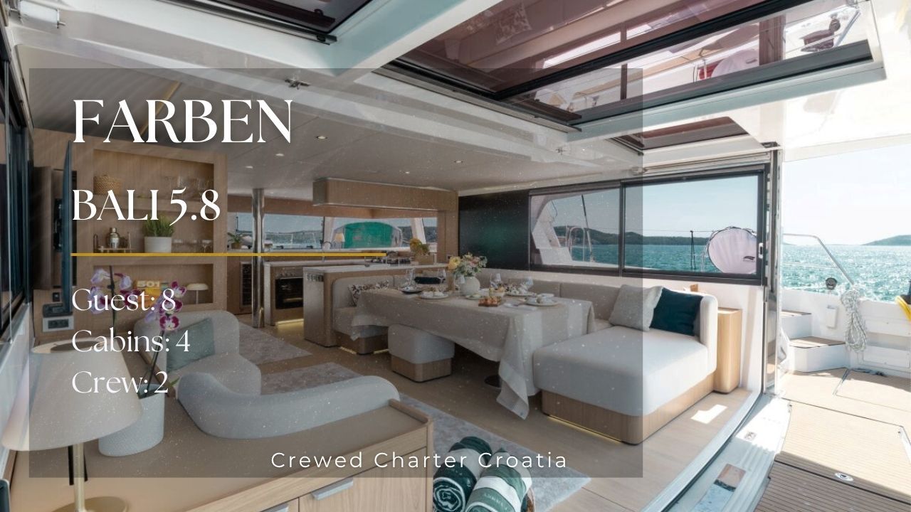 Designed for larger groups, the Bali 5.8 combines luxurious living areas, panoramic retractable windows, and an extended foredeck lounge for a premium sailing experience.