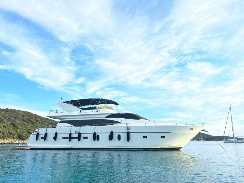 For more pleasant sailing and comfortable life onboard there is a special equipment such as Bow thruster, Air Conditioning, Towels, Bimini top, Coffee machine, TV + DVD.